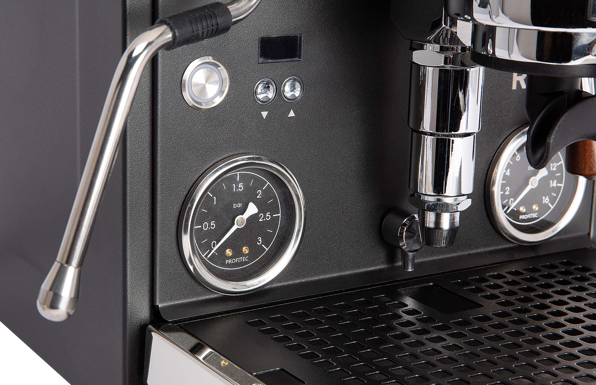 Und dann dieser Look: Die eleganten matt schwarzen Seitenwände, heben sich, wie auch die Reling, kontrastreich von der satinierten Front, der Tassenablage und der silbernen Wasserauffangschale ab. Die Manometer harmonieren mit der Displayanzeige und runden das Erscheinungsbild ab.